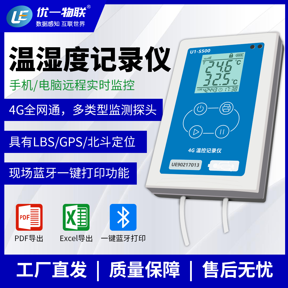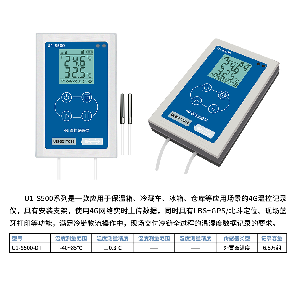 U1-S500 系列是一款應(yīng)用于保溫箱、冷藏車、冰箱、倉庫等應(yīng)用場景的4G溫控記錄儀,具有安裝支架,使用4G 網(wǎng)絡(luò)實時上傳數(shù)據(jù),同時具有LBS+GPS/北斗定位、現(xiàn)場藍(lán)牙打印等功能,滿足冷鏈物流操作中,現(xiàn)場交付冷鏈全過程的溫濕度數(shù)據(jù)記錄的要求。